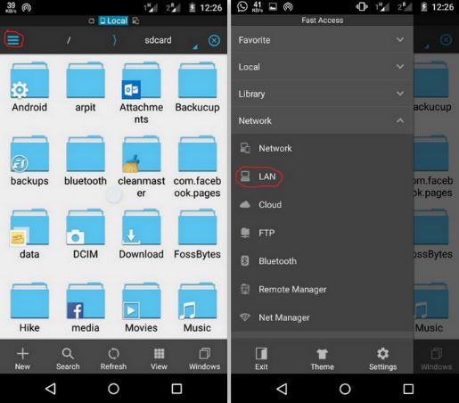 Step 2:Â In order to access files from hard drive with smartphone open ES file explorer. Â Now click on the three line hamburger symbol then click on LAN