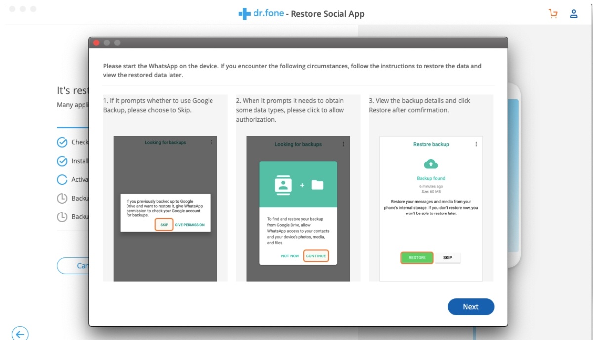 Here we will use Dr. fone Restore Social App tool to transfer WhatsApp messages from Android to iPhone. Here are the steps –