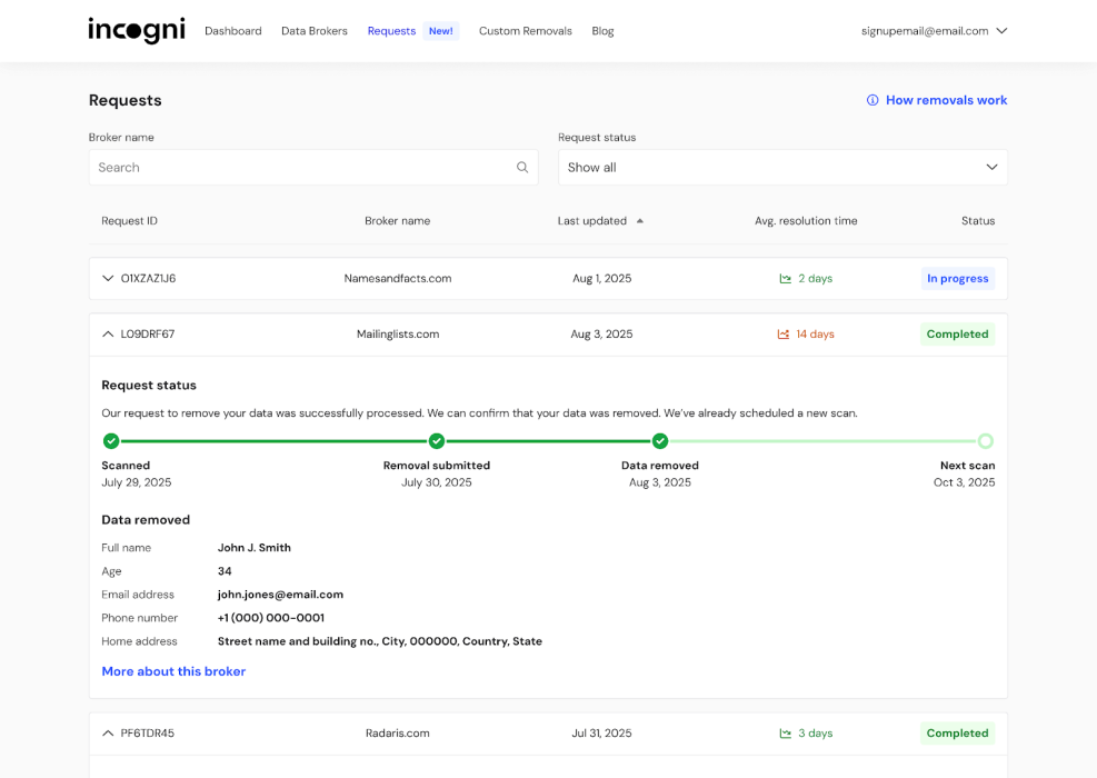 Once you sign up and verify your identity, Incogni can act on your behalf and start sending removal requests to hundreds of data brokers. However, it doesn’t stop here; it continues to monitor the situation, discovering new sources with your data or resending removal requests to brokers that failed to respond.