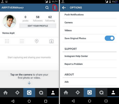 To save your Instagram photos during the upload, you have to follow some pretty simple steps. Open Instagram app on your device and go to app settings by clicking on the hamburger symbol located at top right corner. Now find and enable Save Original Photos option. This will automatically save a copy of the image you upload on Instagram from next time.